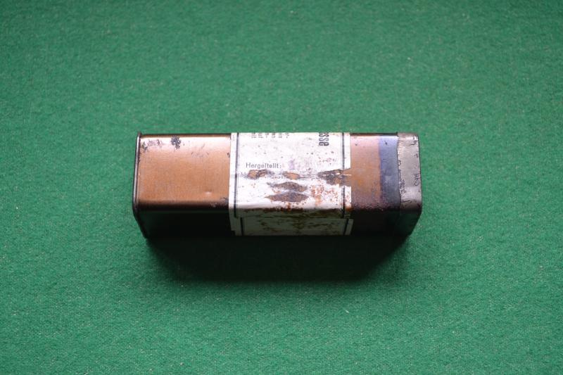 A 4 metre compression bandage in its original tin and still wrapped inside, makers label and details mostly complete, there is a date but hardly readable, tin in good condition with some light surface rust.