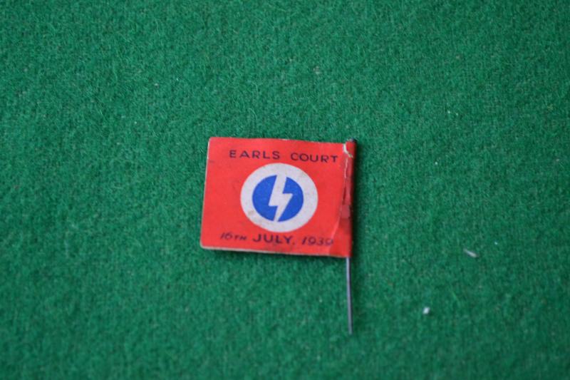 A very rare paper flag pin for a meeting at Earls Court 16th July 1939, around 30,000 attended and was led by Oswald Mosely, being paper not many would have survived.