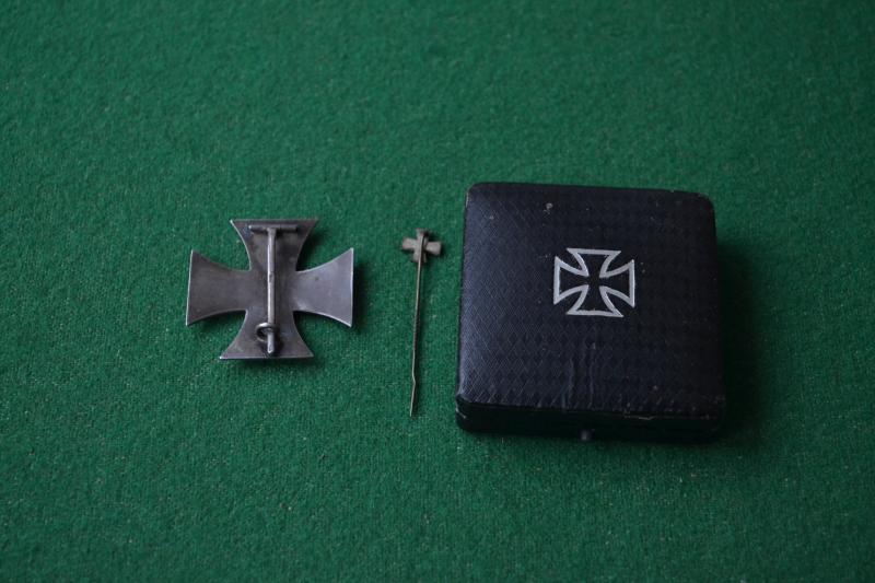 Convex cross in excellent condition, stamped 800 on the pin and complete with its case of issue and stick pin miniature, nice set.