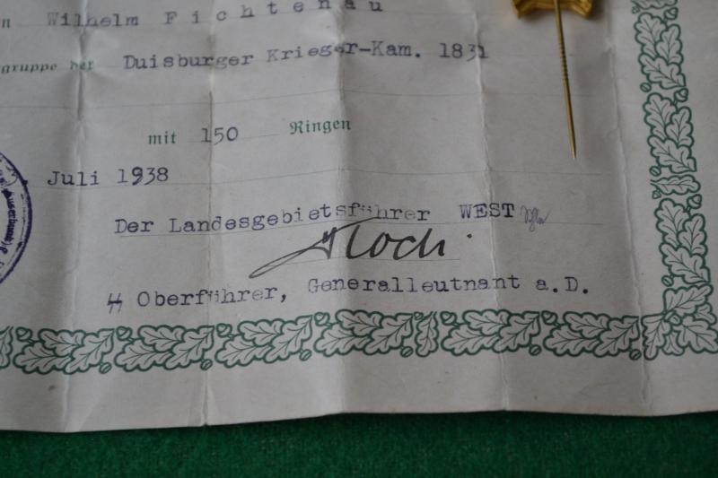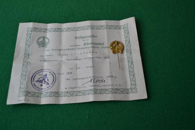 Scarce gold class in mint condition along with its rare certificate dated 1938 and signed by an SS Oberfuhrer General Leautnant a,D. certificate has been folded.