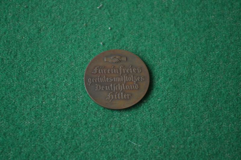 A 45mm medallion showing Hitler and Hindenburg with a slogan on the reverse.