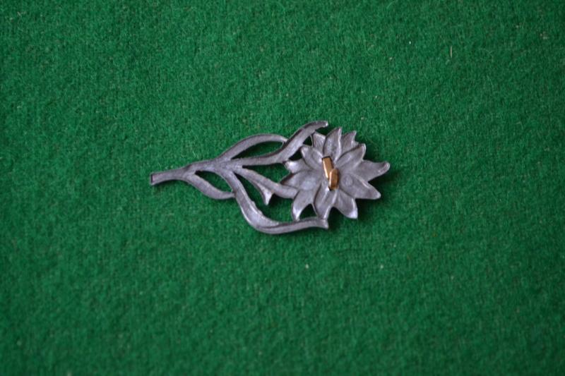 Two piece alloy edelweiss as worn on the caps of units in mountainous regions, RZM marked on the reverse.